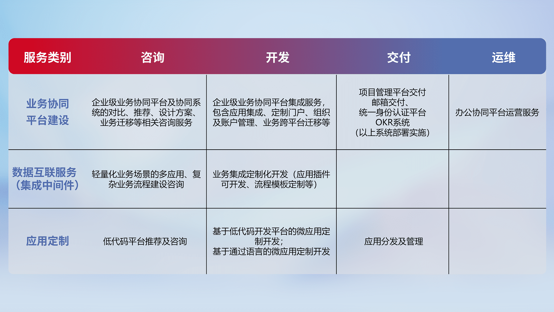 针对钉钉、、、、企微、、、、IDaas等平台级产品提供产品的规划、、、、方案、、、、交付、、定制化开发等服务,,,实现如统一协同办公、、、、智能客户服务、、混合会议管理、、、智能数据查询、、、等业务场景,,,实现数字化转型。。。