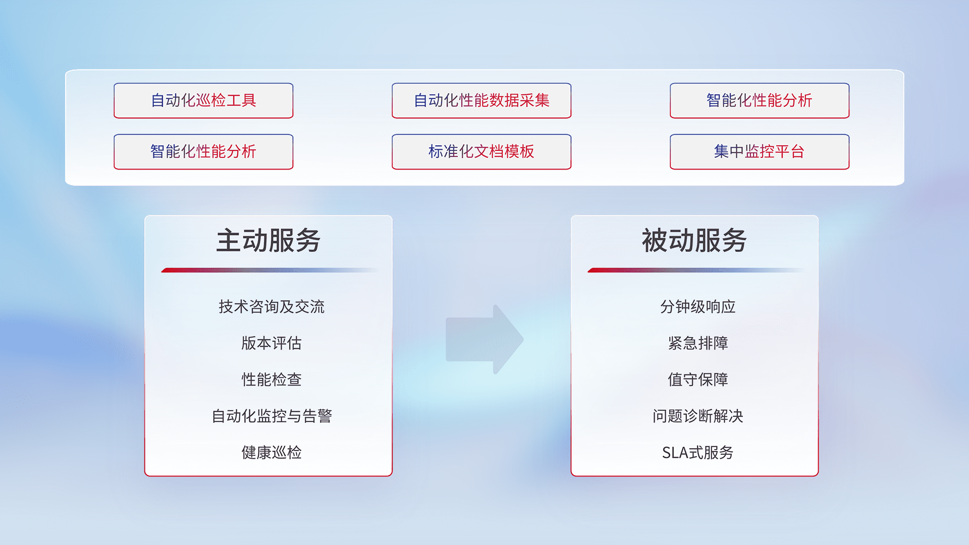 智能化工具和标准化文档,,,,保障服务质量,,,提供主动服务(包含技术咨询、、、版本评估、、、、性能检查、、、、自动化监控与告警、、健康巡检)和被动服务包含(分钟级响应、、紧急排障、、、、值守保障、、、问题诊断解决、、SLA服务)。。